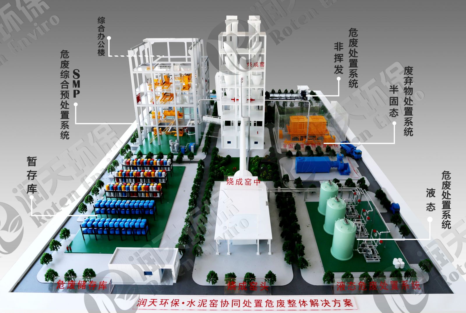 潤天環(huán)保研發(fā)建設(shè)的危險廢物水泥窯協(xié)同處置中心不但包含危險廢物暫存庫、固態(tài)半固態(tài)處置系統(tǒng)、非揮發(fā)性固態(tài)危廢處置系統(tǒng)、液態(tài)處置系統(tǒng)等主要組成部分,同時還包含危廢化驗室、除臭系統(tǒng)、主動氮氣保護系統(tǒng)、自動二氧化碳滅火系統(tǒng)、ERP配伍軟件分析系統(tǒng)等輔助組成部分。利用水泥窯協(xié)同處置危險廢物作為一種新興的危險廢物處置技術(shù),對部分以往只能焚燒和填埋的危險廢物進行再利用,既實現(xiàn)了資源利用又節(jié)約了處置成本。